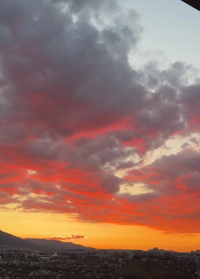 dramatic sunset over a city with a mountain in the background. The sky is filled with dark gray clouds, vividly illuminated with orange and red hues from the setting sun. The cityscape below includes buildings and trees, appearing small in comparison to the vast sky. A corner of a building is visible in the upper right of the frame, suggesting the shot is taken from an elevated position. Birdsong can be heard in the background.