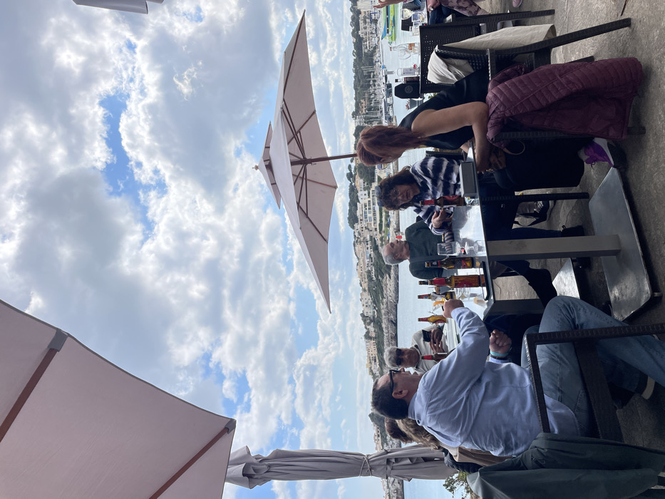 An outdoor scene in Porto Cristo, Spain, depicts a group of six adults seated around a square, reflective table under a partially cloudy sky