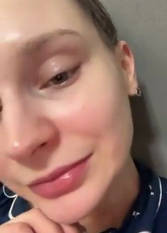 A close-up shot features a woman wearing a blue pajama top with white star patterns. Her hair is pulled back in a bun, and she has fair skin with a slight pink tint on her cheeks. She wears small hoop earrings. The background appears to be a gray wall. She is looking at the camera and leans her cheek on her hand. Her expression is neutral and then she smiles.