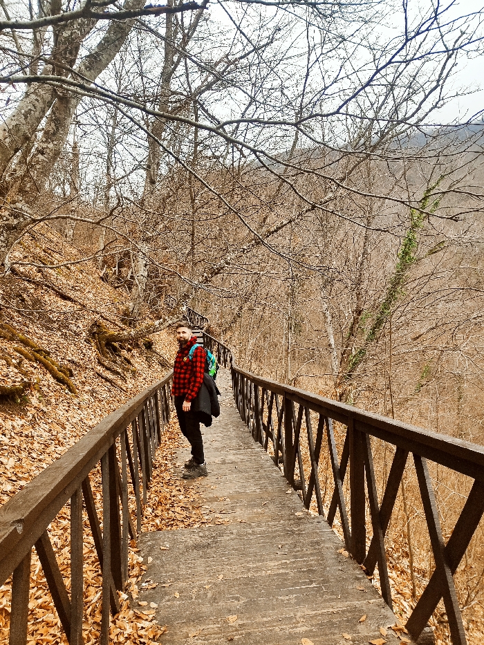 A person with a beard, wearing a red and black checkered shirt and black pants, stands on a wooden bridge in an autumnal forest. They have a blue and green backpack on. The bridge, covered in fallen leaves, has wooden railings and an intricate latticework design. The surrounding landscape consists of bare trees and a hillside covered in fallen leaves, suggesting it's late autumn or early winter. The sky appears overcast.
