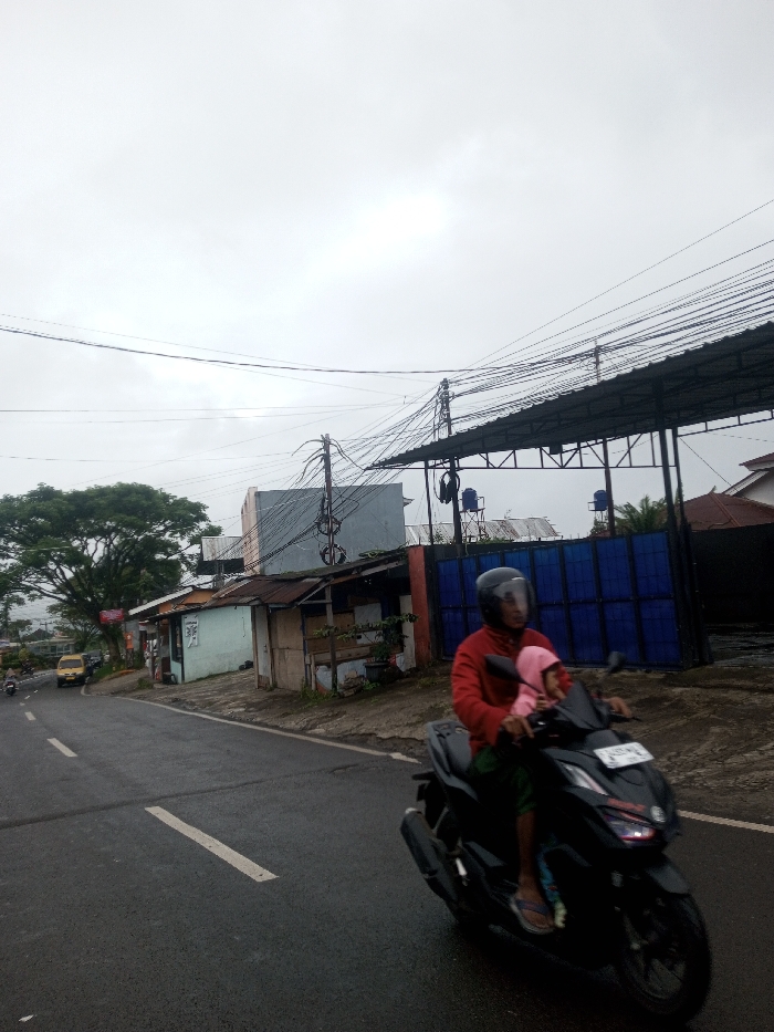 This image depicts a street scene in Babaliya Mal., India, under an overcast sky. The asphalt road, appearing wet, features broken white center lines and a solid white line on its right edge. In the foreground, a dark-colored scooter is in motion, heading slightly rightward. The driver wears a red long-sleeved shirt, dark bottoms, and a black full-face helmet with a clear visor. A child, wearing a pink hooded top and light-colored clothing, is seated in front of the driver, holding the handlebars, and is not wearing a helmet. The scooter has a front license plate, partially obscured. Along the right side of the road, a dirt shoulder precedes a series of structures. These include several small, utilitarian buildings with corrugated metal roofs and varying wall finishes, such as pale blue paint and unpainted concrete. Further back, a grey concrete building is visible, with a utility pole in front of it heavily adorned with a dense array of overhead power and communication lines. To the far right, a large dark metal canopy extends over a blue gate or wall, behind which two blue cylindrical water tanks are mounted on elevated supports. In the background on the road to the left, another motorcycle and a yellow car are visible.