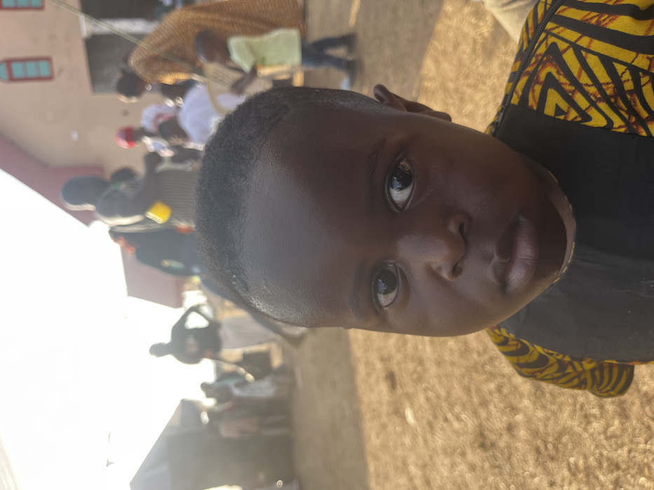 The image depicts an outdoor social gathering in Ajikemai, Nigeria, under bright natural light, likely late afternoon. In the immediate foreground, a dark-skinned child, estimated to be between two and four years old, is centered and looking directly at the viewer. The child has dark, closely cropped hair, wide dark eyes, and is wearing a black long-sleeved garment with distinctive yellow and orange patterned fabric on the shoulders and upper sleeves. The background is out of focus, showing multiple blurred figures, both adults and children, distributed across the scene. To the left, a group of people is visible near a dark tent or canopy structure. Towards the center-right, a person in a light-colored, patterned dress appears to be interacting with a smaller child wearing a light green shirt and dark pants. Another individual is seated in a light-colored plastic chair. In the far background, a light-colored building with a red sloped roof and red-framed windows is partially visible. The ground is dry, light brown earth or sand.