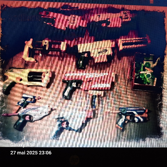 variety of toy guns laid out on a patterned surface. The toys are arranged in a casual manner, suggesting that they were recently played with. The image appears to have been taken indoors, possibly on a floor or table. The toys include a large Nerf gun, a smaller red and black gun, a green and yellow gun, and a blue and black gun. The toys appear to be in good condition, with no visible damage or wear. The image is slightly blurred and has a vintage filter applied. The image appears to be taken in Illkirch-Graffenstaden, France, based on the coordinates provided. The image was taken on May 27, 2025 at 23:06. The image was taken on a Galaxy A51 phone.
