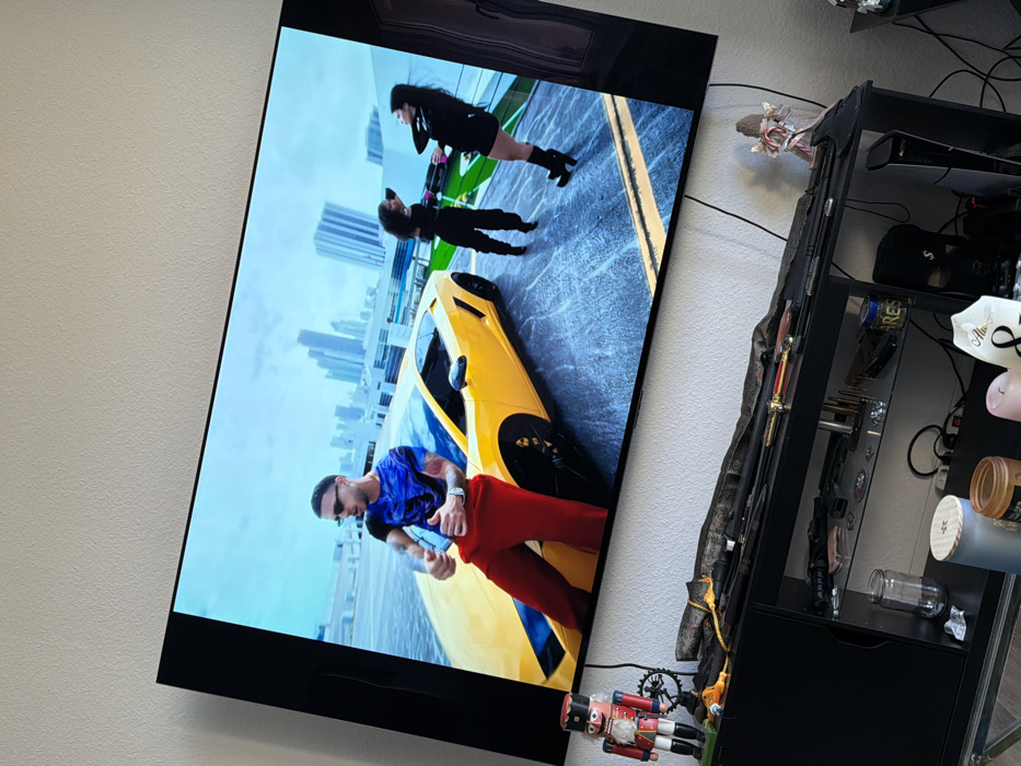 A television screen, tilted slightly, displays a video featuring three individuals and a yellow sports car on an elevated concrete surface with a modern cityscape in the background under a blue sky