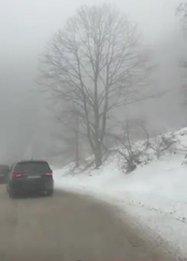 The video depicts a snowy, foggy road scene