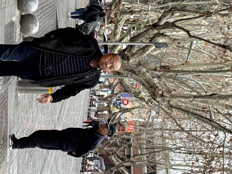 The image depicts a street scene in Beibei, China, characterized by numerous large, mature deciduous trees with bare branches lining the thoroughfare, indicative of winter or early spring. In the immediate foreground, an East Asian male, appearing to be in his 60s or 70s, with a bald crown and short grey hair, walks towards the viewer with a neutral expression. He wears a dark grey zip-up jacket over a dark blue patterned sweater, dark blue jeans, and a gold-colored watch on his left wrist. He is walking on a cobblestone sidewalk, adjacent to two grey spherical bollards and a silver cylindrical bollard to his left. In the mid-ground to the right, another East Asian male, also appearing older, stands with his hands clasped behind his back, facing partially left, towards the foreground subject. He is dressed in a black baseball cap, a black jacket, black pants, and black and white athletic shoes. The street itself features a paved road on the right, separated from the cobblestone sidewalk by a low curb and small dark bollards. In the background, beyond the two men, the street recedes, revealing several other pedestrians, some parked cars (partially obscured), and electric scooters. Buildings with red accents are visible behind the dense network of tree branches. Street furniture includes lampposts with integrated lights, security cameras mounted on poles, and traffic signs; specifically, a red circular 'Stop' (marked with the Chinese character 停) sign and a blue circular 'Turn Right' sign are visible in the mid-ground.