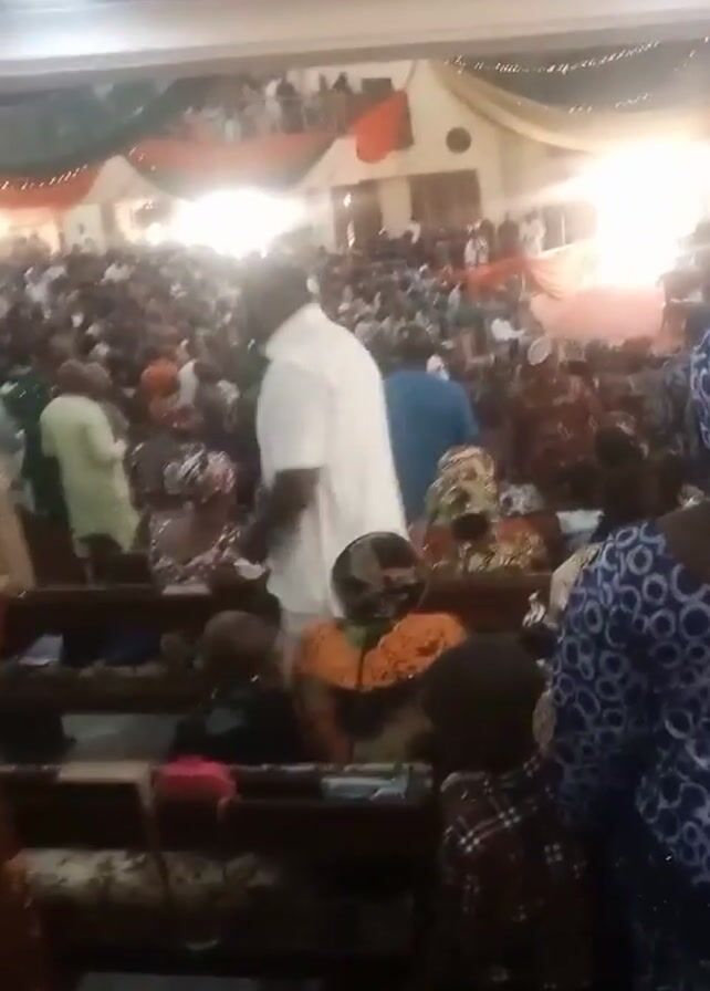 packed church or event hall, likely in Africa, based on the attire and decorations
