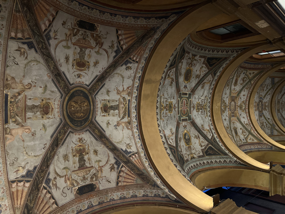 The image showcases an ornate, arched ceiling adorned with classical frescoes