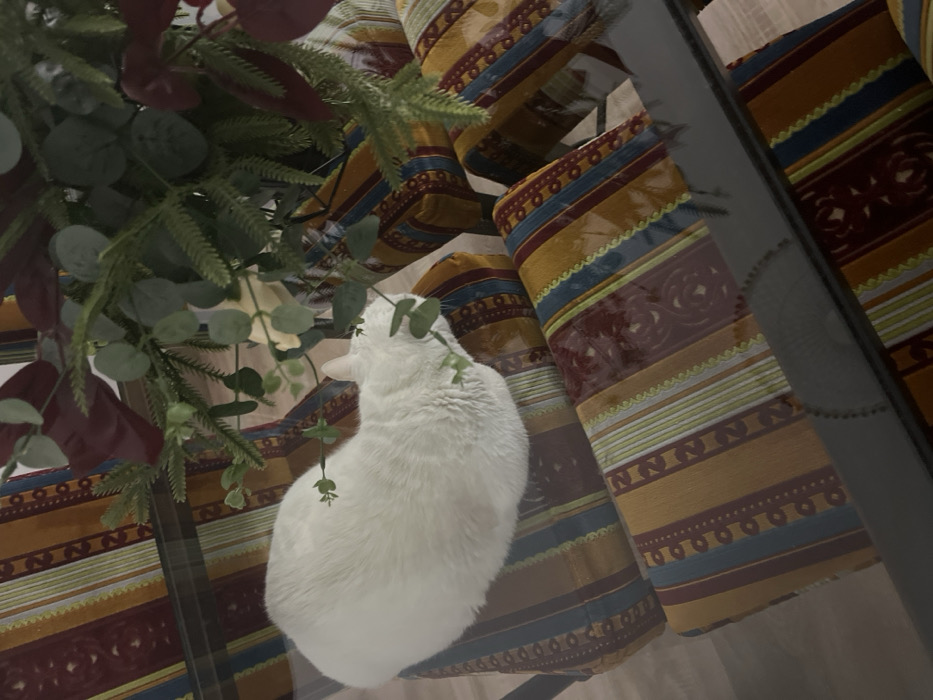 The image depicts an indoor scene, likely a domestic setting such as a dining area, though its specific location within Dos Hermanas, Spain, cannot be determined from visual evidence. The primary subject is a white, short-haired domestic cat, positioned in a relaxed, loafed posture on a patterned chair cushion. The cat's head is turned towards and partially obscured by a decorative plant arrangement. The plant, centered on a clear glass table, consists of various artificial or preserved green foliage, including eucalyptus-like leaves and conifer-like branches, along with some reddish-purple leaves. The cat's nose appears to be in close proximity to, or in contact with, the plant's leaves. The glass table surface occupies the lower and central foreground, reflecting the patterned cushions of multiple chairs visible beneath and around it. These chair cushions feature a distinct design of horizontal stripes in shades of orange, blue, red, gold, and green. The room's lighting is even, suggesting an interior space without strong direct sunlight. No human figures are present.