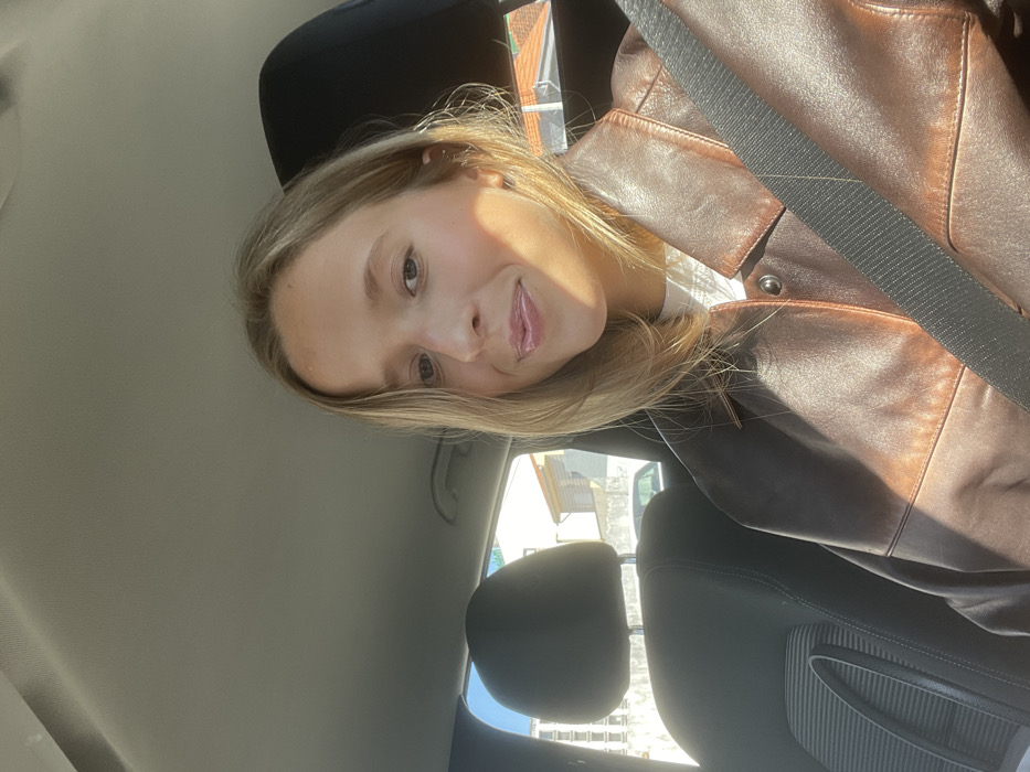 A young Caucasian female with medium-length blonde hair is seated in the driver's position of a vehicle