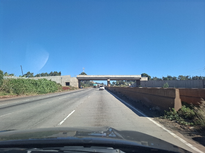 view of a paved highway in Nduma, Kenya (latitude: -1.181, longitude: 36.644). The highway has a concrete overpass running perpendicular to the road. The overpass is in the background, partially obscured by foliage. The image appears to have been captured from a vehicle traveling on the highway, as a black car's windshield and dashboard are in the foreground. The sky is clear blue with minimal clouds. There is a small amount of greenery and trees along the sides of the road, with more trees in the distance. Two vehicles can be seen in the distance driving on the highway. The vehicles are a white car and a truck. The road is empty in the foreground. The highway is a four-lane road. The left shoulder is unpaved. The right shoulder is paved with a concrete barrier. The road is relatively straight, with no visible curves or turns. The image appears to have been captured during the day, as there is no indication of nighttime lighting.