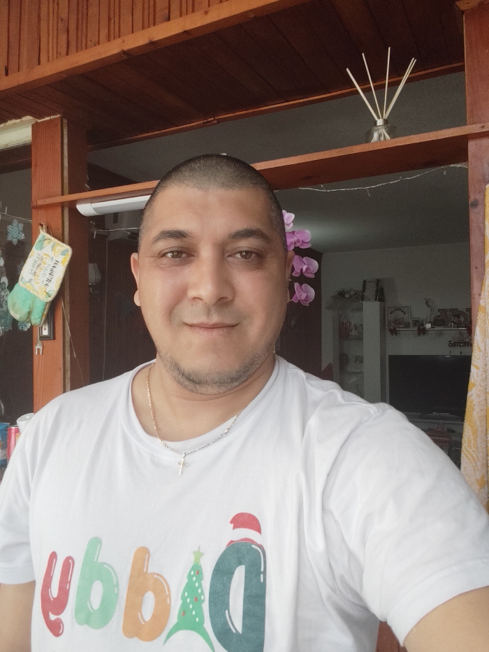 This image captures a male subject in a medium shot, looking directly at the camera with a faint smile, within a structure located in Galabovo, Bulgaria
