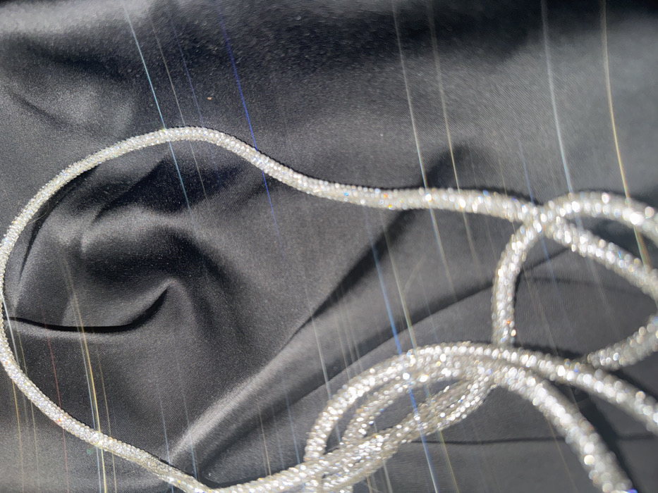 - "The image presents a close-up, overhead view of a flexible, rope-like object composed of numerous small, highly reflective elements, possibly rhinestones or crystals, laid upon a dark, wrinkled fabric surface" by FM-fUhp03, licensed under CC BY 4.0