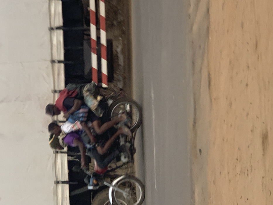 A crowded motorcycle carries at least four people and a large bag. The individuals appear to be traveling on a paved road, adjacent to a dusty, light-brown surface. The scene seems to be taken from an elevated vantage point, with a section of a white structure, possibly a building or wall, and a striped pole visible on the left side of the frame. The motorcycle and its passengers are heavily loaded, suggesting a challenging journey.