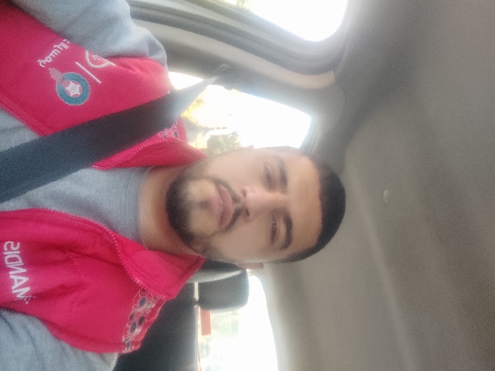 A male individual with short dark hair, a trimmed beard, and mustache is seated in what appears to be the passenger seat of a vehicle