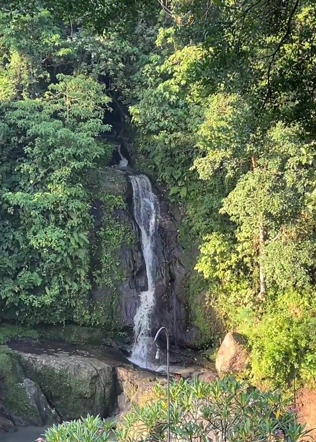 waterfall surrounded by lush green vegetation. The water cascades down a rocky cliff into a small pool. There is a paved area with plants and a wooden railing in the foreground. The scene appears to be outdoors in a natural setting.