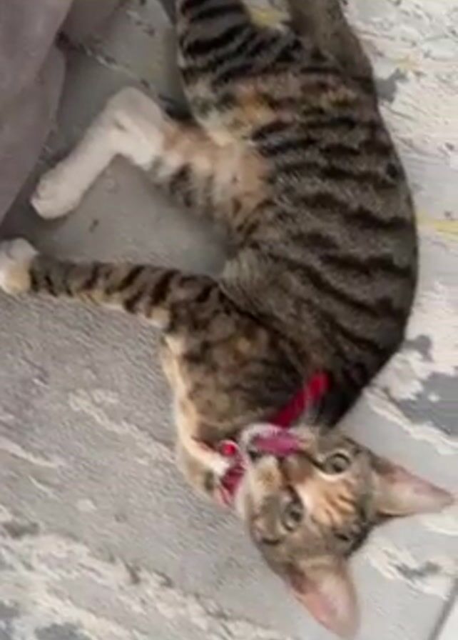 A close-up, downward-angle shot shows a brown tabby cat with a red collar lying on its back on a patterned rug, stretching its legs in the air and looking up