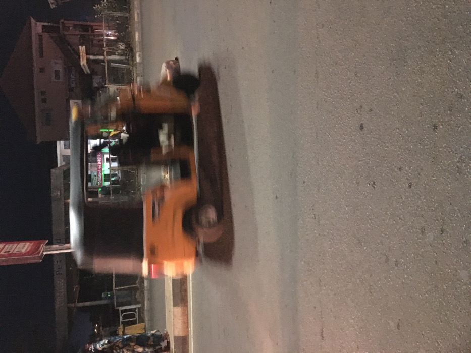 The image displays a nighttime street scene in Barden Yana, Nigeria. An orange and black three-wheeled vehicle, consistent with a keke napep or auto-rickshaw, is in motion on a dark asphalt road, exhibiting motion blur. A driver is partially visible within the vehicle. On the left side of the frame, a person in patterned attire stands on a concrete sidewalk adjacent to a curb. In the background, a street pole featuring a red sign with "MIKAN PET" partially legible is positioned in front of a petrol station canopy with visible internal lighting. Beyond the petrol station, a multi-story building and fencing are discernible. The scene is illuminated by artificial light sources.