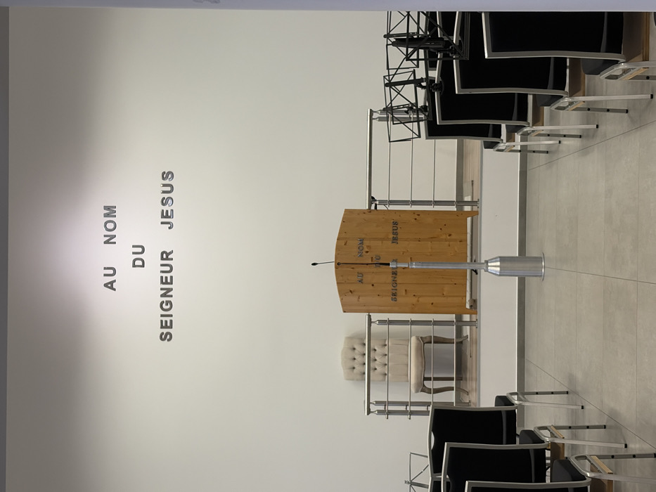 This image displays the interior of an empty assembly hall or religious venue in Beringen, Luxembourg
