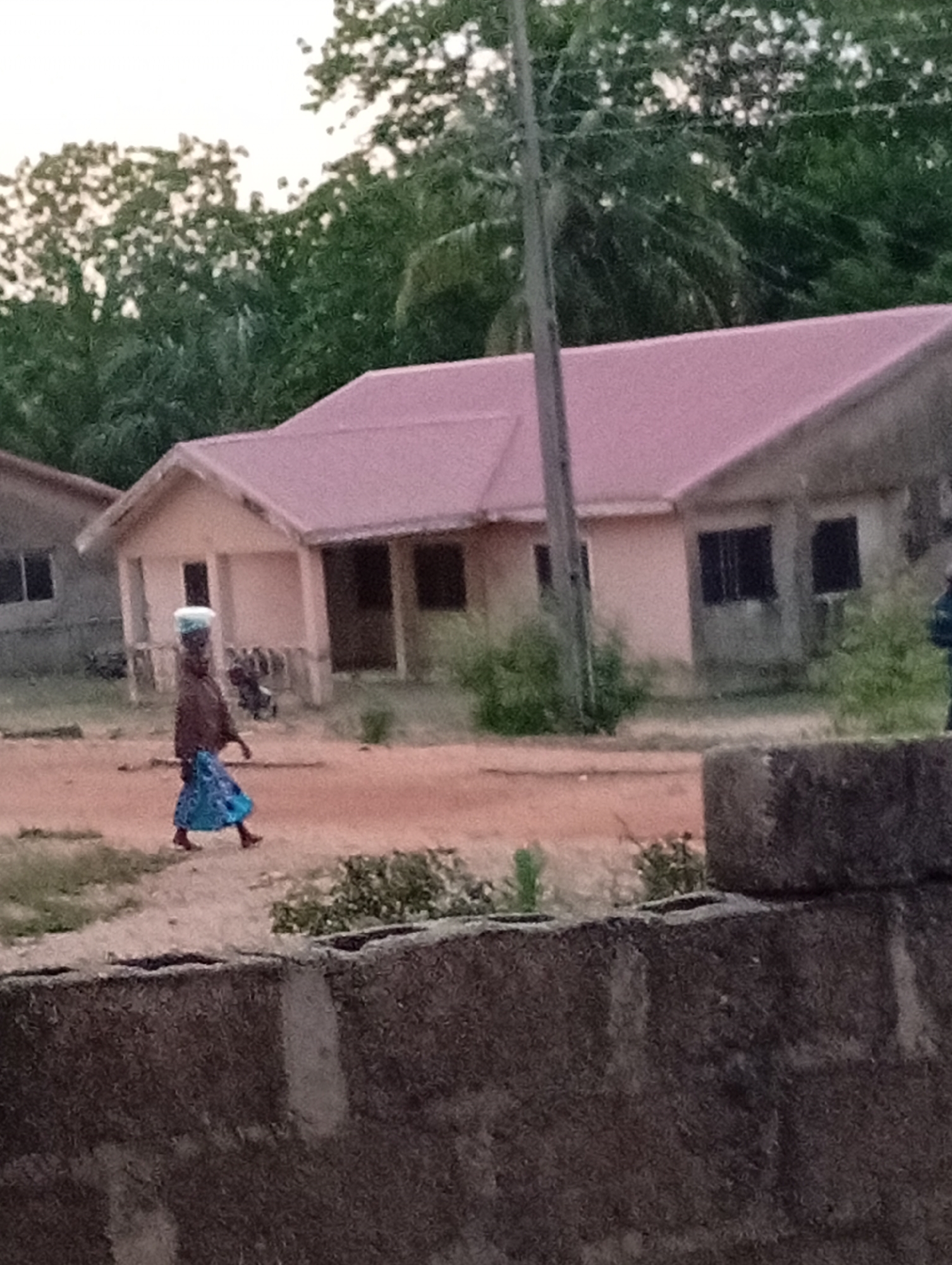 A woman walks along a dirt road in Adankolo, Nigeria, carrying an object on her head. She wears a dark-colored top and a blue skirt with a patterned design. The road is flanked by buildings, one of which has a light-colored exterior and a reddish-pink roof. The environment includes green trees in the background and a concrete wall in the foreground. A utility pole is also visible near the building.