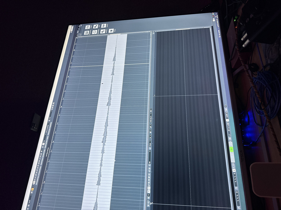 The image depicts a dimly lit indoor environment in Vagharshapat, Armenia, focused on a computer workstation. A large computer monitor, branded "TESLA" on its lower bezel, displays a digital audio workstation (DAW) interface. The screen prominently features an audio timeline with a single track exhibiting a complex waveform, potentially labeled "Guitar (01)", positioned above a dark, gridded lower panel. A small black device, consistent with a webcam, is mounted centrally on the top edge of the monitor. On the desk below the monitor, a braided reddish-brown cable spans the foreground. To the left, a coiled bundle of blue cables is visible, while to the right, a black audio interface or similar electronic device has two cables plugged into its front. A blue LED light emanates from beneath the monitor, illuminating parts of the desk. A light-colored, unidentified object with rounded edges is partially visible in the lower-left corner. No individuals are present.