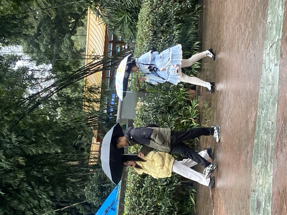 Three individuals walk in the rain. The first person, wearing a light blue dress, holds a colorful umbrella. The second and third persons, dressed in casual clothes, share a single black umbrella. They are walking on a paved pathway lined with greenery. Bamboo trees and a building structure are visible in the background. The scene suggests an outdoor setting during wet weather.