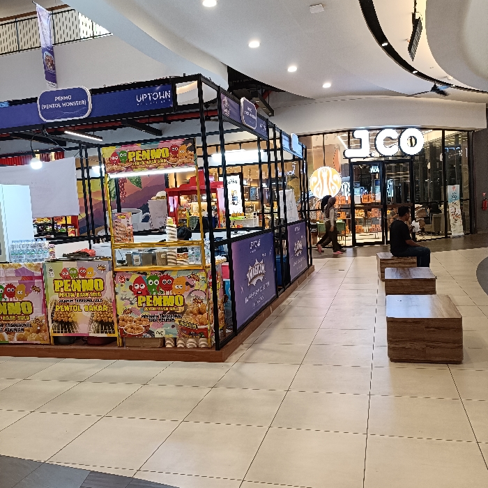 food stall in an indoor shopping mall, likely located in the city of Semarang, Indonesia. The stall is made of black metal framing and features a variety of brightly colored signage, including a large yellow sign reading "PENNO PENTOL BAKAR". The stall is selling various food items, including what appears to be fried snacks and drinks. There are two customers seated on wooden benches near the stall. The flooring is tiled and the lighting appears to be fluorescent. The environment is well-lit and clean, with an air of bustling activity. The image is taken at an angle, showing the food stall from a slightly elevated perspective. The location is confirmed based on the provided coordinates, which place it within the Kecamatan Mijen district of Semarang.