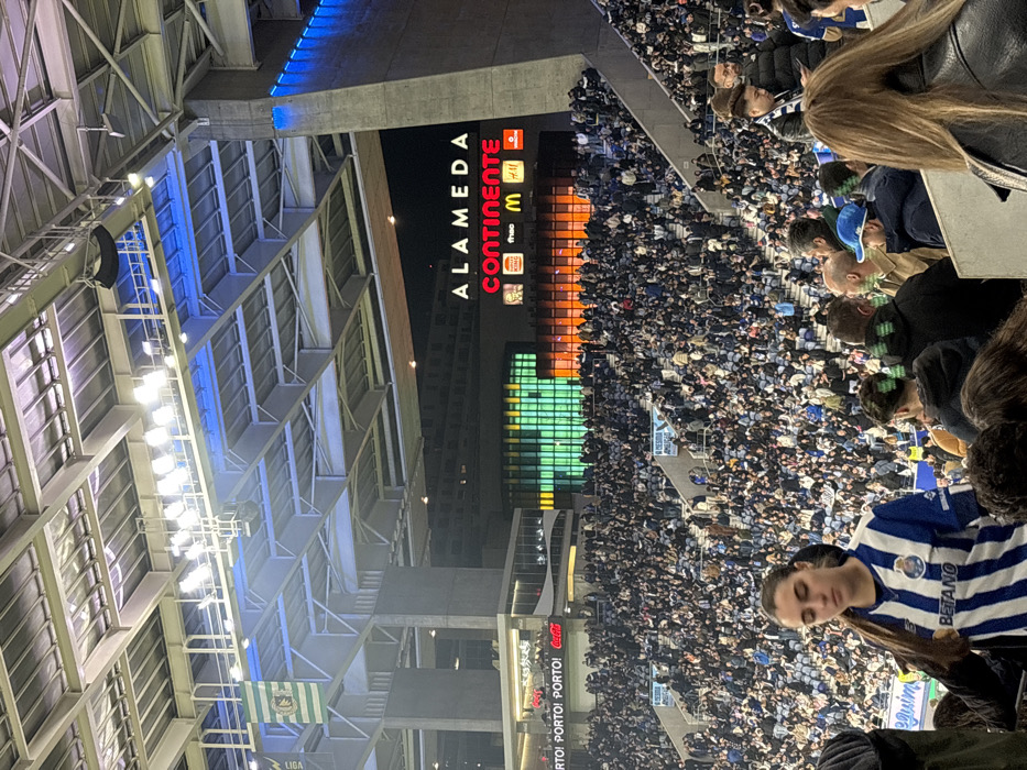 An angled view of a packed stadium at night. Bright lights illuminate the metal framework of the roof on the left. A large scoreboard displays advertisements for Alameda, Continente, McDonald's, and others. A green and yellow pixelated design shines below the advertisements. A sea of spectators fills the stands, with a person in a blue and white striped jersey prominent in the foreground. Coca-Cola advertisements can be seen near the bottom of the image.