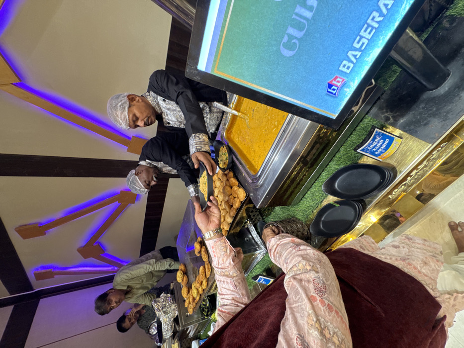 A buffet features a server in a hairnet and black jacket dishing food onto a black plate. The food includes small, round items and a yellow, saucy dish. A sign reads "GUL" with the letters "BB BASERA" below. Stacked black plates are on a gold surface, alongside a label that reads "APNE KAHIH KACHORI". People stand near the buffet with food. Blue lights are visible on the ceiling.