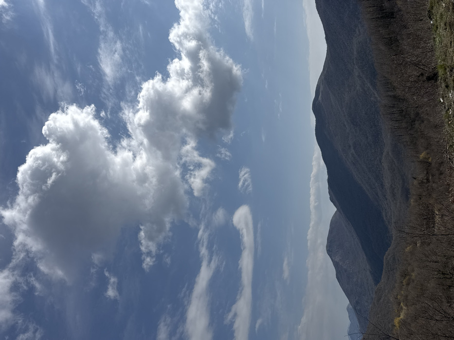 The image presents a panoramic landscape view near Brajici, Montenegro, under a clear blue sky with scattered clouds. A prominent, large cumulus cloud formation, brightly lit on its upper surfaces with darker grey undersides, occupies the upper-center of the frame, accompanied by smaller, wispy white clouds. The lower half of the scene features a series of dark, undulating mountains or large hills, densely covered with deciduous trees in a bare state, characteristic of late winter or early spring. Shadows are distinctly cast across the mountain slopes, indicating directional sunlight. The immediate foreground consists of dry, sparse ground vegetation and bare branches, with hints of new, lighter green foliage appearing on the lower left slope. No human figures or man-made structures are visible.