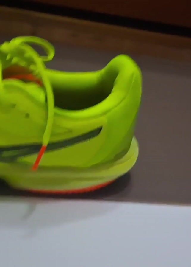 neon yellow tennis shoe sitting on a tile floor. The shoe has black ASICS logo on the side, yellow laces and an orange sole. The tiles are arranged in alternating colors, gray and white. The camera moves around the shoe to show different angles. There is a wooden baseboard in the background.