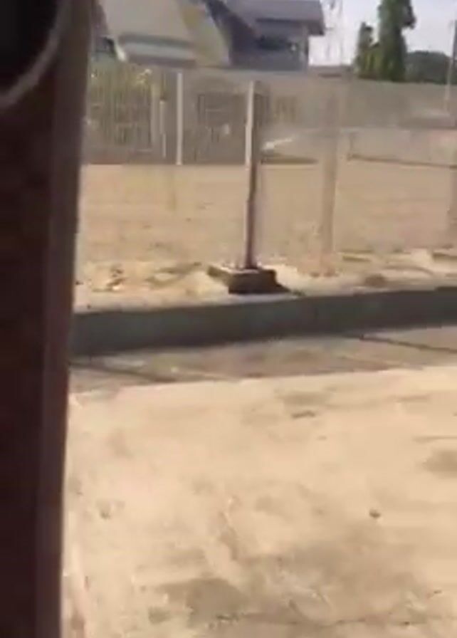 view from a moving vehicle, presumably a bus, looking out a side window. The vehicle is traveling along a paved road beside a fenced-off area. A building with a unique, angled roof is visible behind the fence. As the vehicle proceeds, it turns to the left, revealing a wider view of the street, a tall tree, and a building with a lighter facade. A person on a motorbike drives past the vehicle. Power lines are visible overhead against a light-blue sky. The overall impression is of a sunny day in an urban or suburban setting.