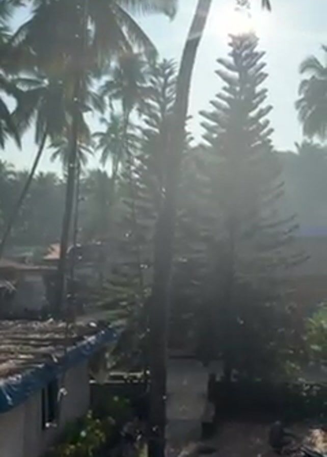 The camera is positioned at an elevated angle overlooking a sunlit, tropical landscape. Several tall palm trees frame the view, their silhouettes defined against the bright sky. Two conifer trees stand in the foreground. Below, rooftops of small buildings are visible, and a motorbike is parked on a brick-paved area. A solitary individual is seated in the distance. The overall impression is one of tranquility.