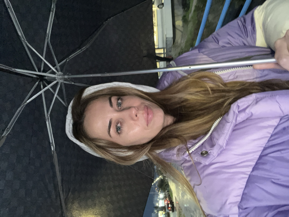 A woman stands beneath an open umbrella, illuminated by ambient light. She wears a light purple jacket with a white hood. Her long, brown hair is slightly disheveled. Her face is clear, and she looks directly at the camera. The umbrella's structure is visible against the overcast sky, and glimpses of city lights can be seen in the background, indicating an urban setting.