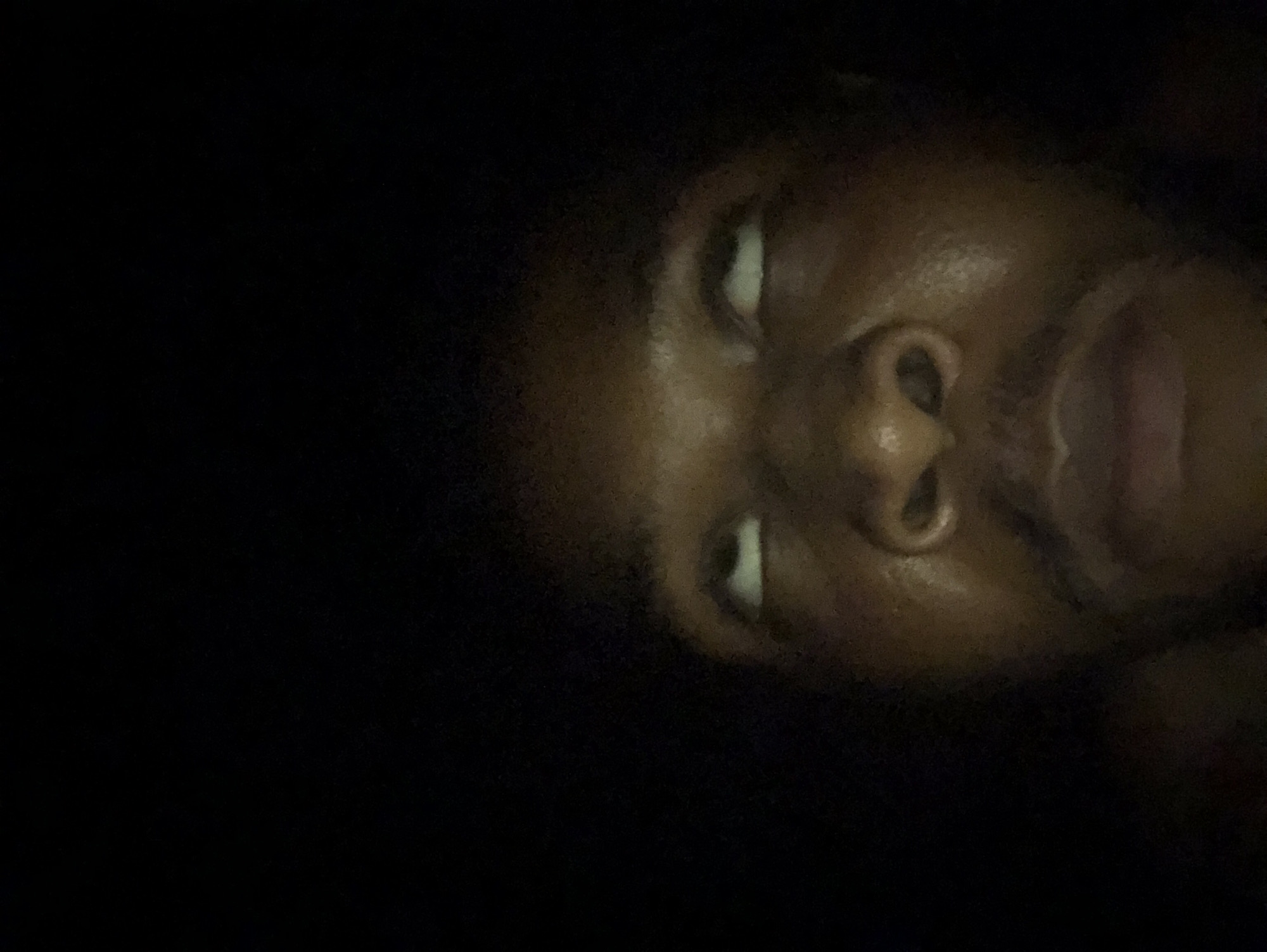 close-up of a person's face in low light conditions. The person has dark skin and appears to be lying down. The eyes are slightly open, revealing the whites. The nose and open mouth are clearly visible. The background is dark and indistinct. The location is Unknown, Unknown.
