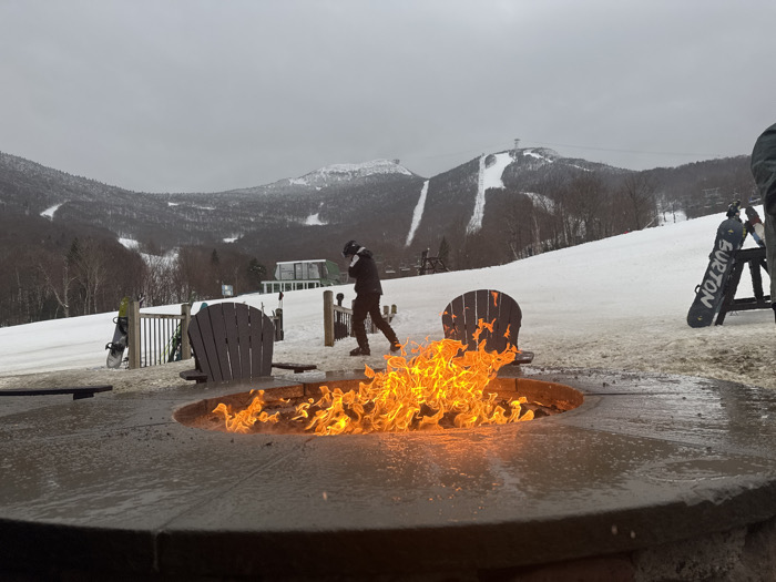 A fire pit burns brightly on a snowy mountain ski resort