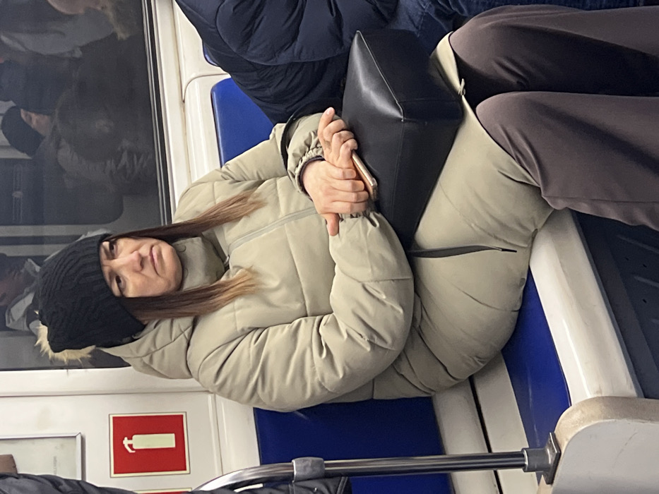 In an indoor shot, a woman is seated on public transport. She wears a black beanie, a light beige puffer jacket, and brown trousers. She clasps her hands together, a phone visible between them, against a black purse. The seating is blue and white. A red fire extinguisher sign is visible on the wall behind her. The photo is rotated, giving a tilted perspective. Other people are visible in the background.