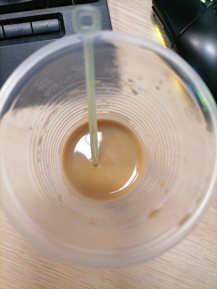 - "A clear, ribbed plastic cup containing approximately one inch of light brown, opaque liquid, consistent with a coffee or milk-based beverage, is positioned on a light-colored wooden surface" by FM-EvR0V2, licensed under CC BY 4.0