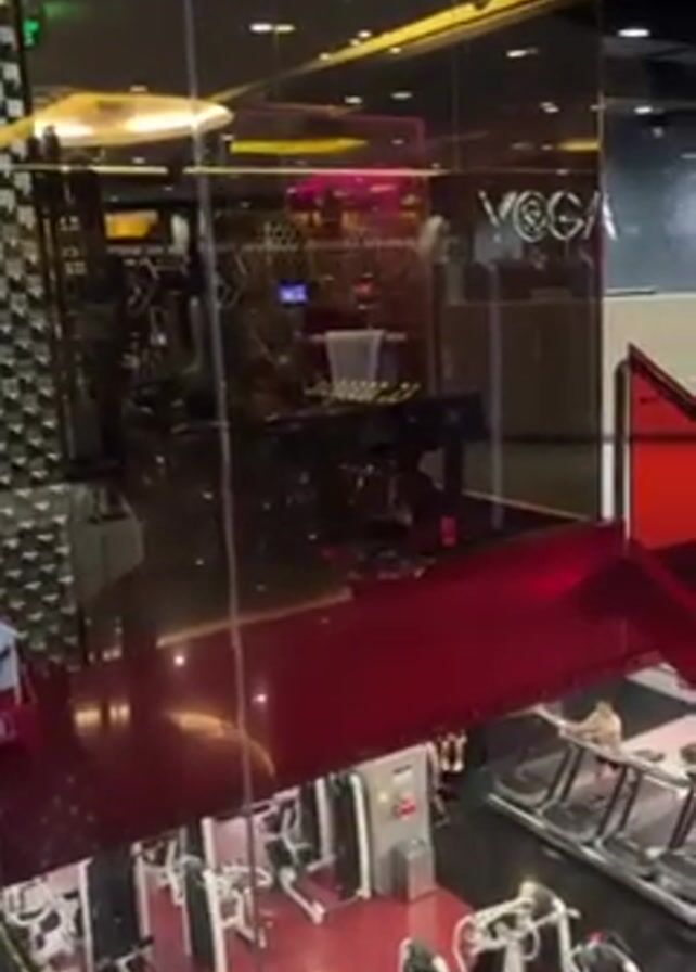 From an elevated vantage point, the camera captures a well-equipped gym. The gym features a red floor, and numerous weight machines are arrayed in an organized fashion. Treadmills are visible along one side, occupied by a few individuals engaged in exercise. Overhead, a mezzanine houses additional gym equipment. The word "YOGA" is prominently displayed on the wall of the mezzanine level. Red stairs lead from the lower level to the upper mezzanine. The gym's design incorporates a sleek, modern aesthetic, evident in the choice of materials and the overall layout.
