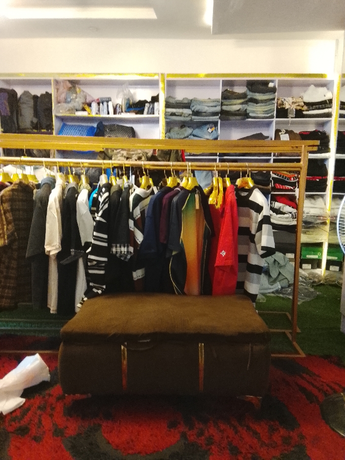 The image displays the interior of a clothing retail space located in Wukari, Nigeria