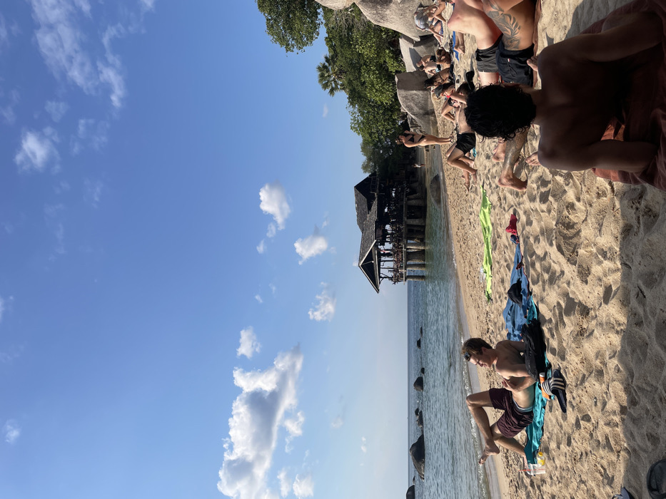 This image captures a bright, sunny beach scene in Tambon Ko Tao, Thailand. The foreground consists of golden-brown sand, where at least three individuals are prominently featured. In the immediate front, facing away from the camera, a person with dark, curly hair lies prone on a reddish-brown towel. To their left, a male with light brown hair lies on his back on a blue towel, wearing dark shorts, with legs bent and crossed; a plastic cup with a red straw, black sandals, and a black bag are beside him. The midground expands to include a sandy beach populated by approximately 10-15 additional individuals, mostly lying on towels or directly on the sand, engaged in sunbathing. One woman in a dark bikini stands near the water's edge, facing towards a stilted building. The calm, blue-green ocean features several large, dark boulders. A prominent two-story wooden building with a dark, multi-layered shingled roof stands on stilts, extending partially over the water from the left side of the beach. Several people are visible on its open-air balconies. The background on the right is characterized by large, smooth, light-grey boulders and dense tropical foliage, including a palm tree. The sky is clear blue with scattered white cumulus clouds. Shadows on the sand indicate direct sunlight.