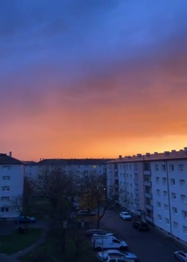 sunset over a neighborhood of white apartment buildings. The sky is a gradient of blue, purple, orange, and yellow. Cars are parked on the street. Bare trees are visible in the foreground. The camera slowly pans to the right.