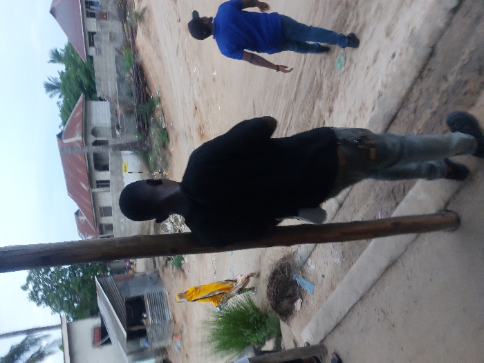 The image displays an outdoor scene in Mwandege, Tanzania, featuring three individuals and various structures along a dirt road under an overcast sky. In the foreground, a male individual is positioned with his back to the camera, standing next to a prominent vertical wooden pole. He wears a black t-shirt, light-colored long pants (possibly jeans) with a visible dark patch on the right thigh, and dark shoes. A light-colored item, possibly a pouch, hangs from his left hip. To the right of the foreground individual, on the unpaved dirt road, a second male figure walks away from the camera. He is dressed in a blue t-shirt, blue jeans, and a dark baseball cap. Further to the left and slightly behind the foreground person, a third individual, obscured partially, walks wearing a bright yellow garment that appears to cover most of their body. The immediate ground consists of a concrete curb running along the lower left side, with green bushy vegetation behind it. The dirt road occupies the center and right, showing an uneven surface with scattered refuse, including a light blue plastic bag. The background features several buildings under construction or in various states of completion. On the far left, a structure with a corrugated silver roof and light-colored walls is visible. Towards the center and right, multiple buildings with reddish-brown corrugated metal roofs and light-colored concrete walls are present. Some of these structures appear unfinished, displaying exposed concrete and construction debris, including stacked rebar-like materials. A small yellow sign is visible on the ground or a low wall between some of these central background buildings. Palm tree foliage is visible at the top edges of the frame.