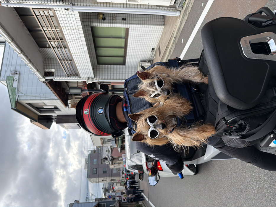 A person is observed from the rear, seated on a white BMW scooter or motorcycle, travelling on a paved urban street in Kyoto, Japan, under an overcast sky. The individual wears a black and red motorcycle helmet featuring an AGV logo and a BMW emblem on the back, along with apparel displaying BMW M color stripes on the neck and shoulder area. Secured to the person's back in a dark carrier are two small, long-haired dogs, consistent with Yorkshire Terriers, both wearing white-framed protective eyewear. The dogs face forward over the rider's shoulders. The street ahead contains multiple white vehicles in what appears to be light traffic, with pedestrians visible further down on the left sidewalk. Buildings line both sides of the street; the structure on the immediate right exhibits white square-tiled siding, a balcony with brown railings, and large windows. The visible motorcycle rear top case also bears a 'BMW' inscription.