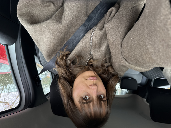 A female subject is depicted in a close-up, front-facing view, seated in the driver's position of a stationary vehicle, within the city of Mougins, France. The individual, appearing to be in her 20s or 30s, possesses medium brown hair styled with bangs and waves. She is dressed in a light brown or taupe zippered jacket/coat and is restrained by a dark-colored seatbelt diagonally across her chest and horizontally across her lap. Her facial expression is neutral, with a slight downturn of the mouth, and her gaze is directed towards the camera. The vehicle's interior features dark-colored headrests and seat upholstery, with a subtle textured pattern visible on the seat to the subject's right. The passenger-side window, visible on the right side of the frame, exhibits water droplets, indicating rain or recent precipitation. Through this window, a red vehicle is partially visible, parked adjacent to the subject's car, along with bare tree branches against an overcast sky, suggesting an outdoor setting such as a parking lot or street.