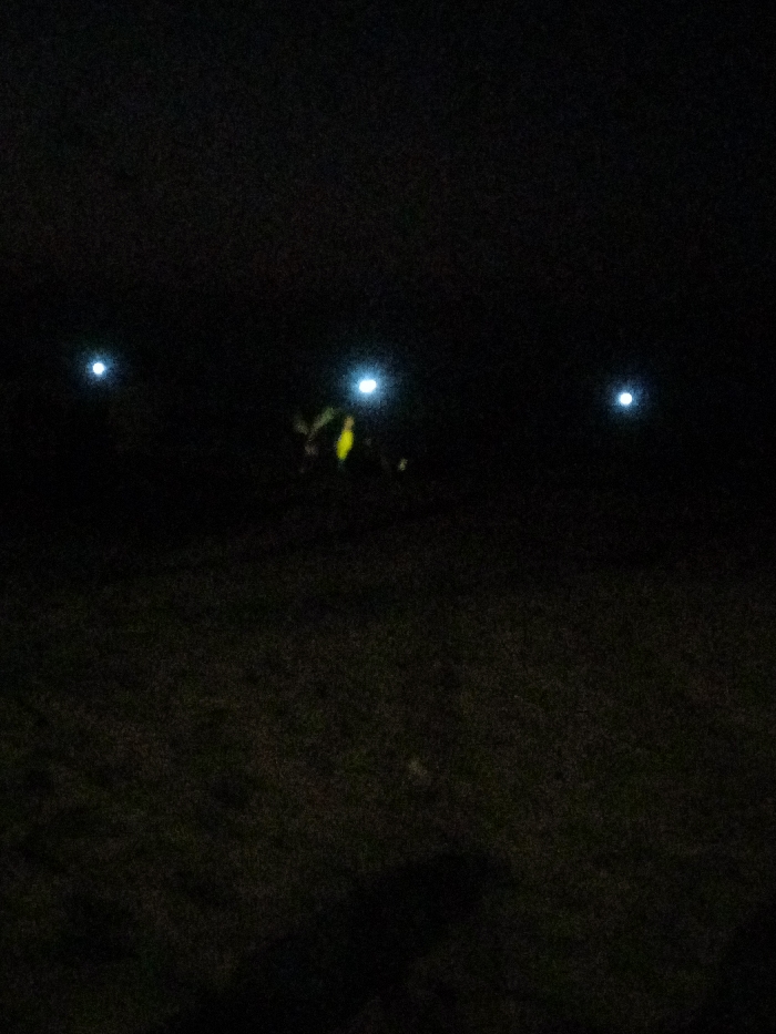 This image depicts a nighttime scene in Al-Mawasi, Palestinian Territories. The environment is extremely dark, with the foreground and midground consisting of indistinct, dark, textured ground, possibly unpaved terrain or sparse vegetation. The sky is completely dark. Three distinct, bright, circular light sources are visible against the dark background. One light is positioned in the upper-left portion of the frame. Another light is in the upper-right portion. A third light source is located near the center of the frame, slightly to the left of the upper-right light. Directly below and slightly to the left of this central light, a blurry, indistinct yellowish-green form is visible. No clear individuals, actions, or other specific objects or interactions are discernible due to the profound darkness and blur.