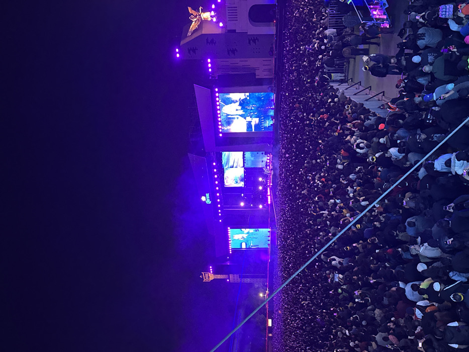 A large crowd is gathered at a nighttime event with a stage featuring multiple large screens and the Corona logo. The stage also has a tall structure topped with a winged figure illuminated in bright light. The crowd is dense, with many people holding up phones, suggesting they are recording the event. The overall lighting is dominated by shades of blue and purple.