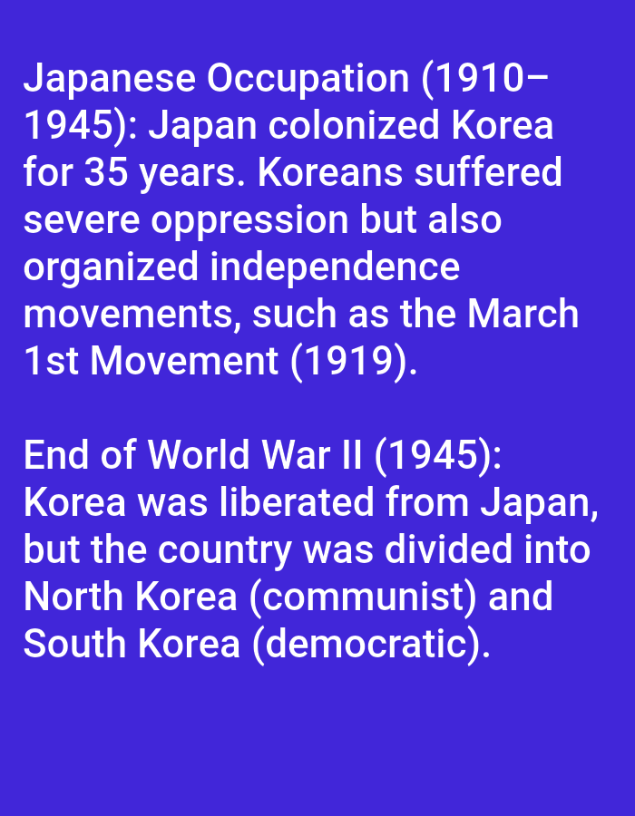 The image displays white text against a solid royal blue background. No physical location is depicted; the image is a digital text display. The text presents two historical sections concerning Korea: 1. **Japanese Occupation (1910-1945):** This section details that Japan colonized Korea for 35 years, causing Koreans to suffer severe oppression. It also mentions that Koreans organized independence movements, specifically citing the March 1st Movement in 1919. 2. **End of World War II (1945):** This section states that Korea was liberated from Japan, but subsequently the country was divided into North Korea (communist) and South Korea (democratic). The image contains no identifiable people, subjects other than the historical entities mentioned in the text, or objects beyond the textual content itself. No discernible actions or interactions are physically occurring within the image frame; all actions described are historical events conveyed via text. The environment is purely a digital interface.