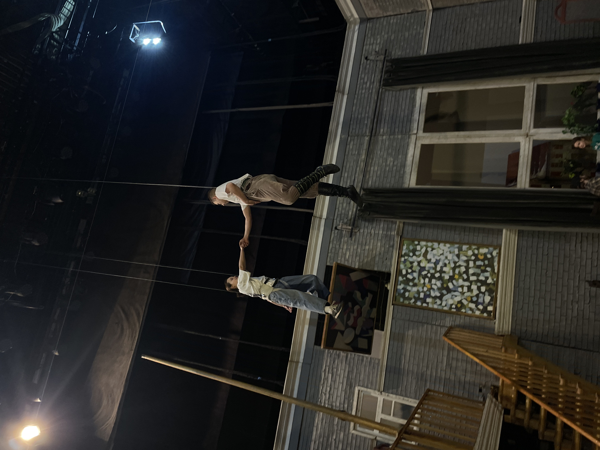 The image depicts an indoor theatrical performance or rehearsal at the Fomenko Workshop Theatre, New Stage, located on Kutuzovsky Prospekt in Moscow, Russia. Two individuals are suspended high above a stage set, secured by visible rigging wires from the dark overhead ceiling, which features stage lights and industrial structures. The performer on the left is a female wearing a white short-sleeved t-shirt, light blue loose-fitting jeans, and sneakers, with a harness visible around her waist. She extends her right hand to grip the left hand of the second performer. The performer on the right is a male, dressed in a white t-shirt, light brown or khaki-colored trousers, and tall black boots, also secured by a harness. Both are positioned horizontally in mid-air relative to the vertical stage set. The stage set mimics a multi-story building exterior, constructed with walls clad in gray shingle-like panels. A light-colored wooden staircase with railings ascends from the lower left toward the upper left, partially obscuring a white-framed window. Two framed artworks hang on the gray wall: an upper, darker piece with abstract geometric shapes, and a lower, brighter painting with a mosaic-like pattern of small white, yellow, blue, and green blocks. A large, multi-pane white-framed window dominates the lower right section of the set, flanked by dark curtains. Through this large window, several individuals are faintly visible on a lower level, appearing to be audience members or crew. A tall wooden pole stands vertically on the left side of the scene.