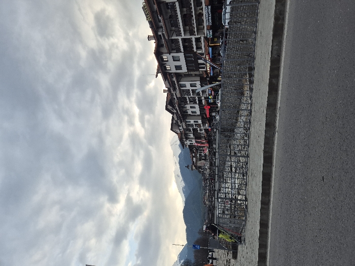 The image displays an urban scene in Bansko, Bulgaria, under an overcast sky featuring light grey clouds